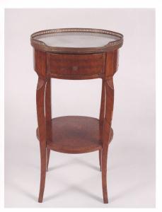 Piccolo tavolino rotondo a due piani in legno impiallacciato e intarsiato con motivo decorativo a cubi; un cassetto nella fascia centrale, gambe lievemente ricurve con unghiatura nella parte superiore, piano in marmo con finitura traforata in bronzo dorato.