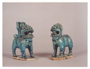 Piccole sculture a forma di cane Pho con le fauci spalancate che permettono di vedere i denti e la lingua; criniera ricciuta e pelo definito attraverso striature. Al collo uno scarabeo, mentre uno dei due regge sulla schina una piccola divinità.