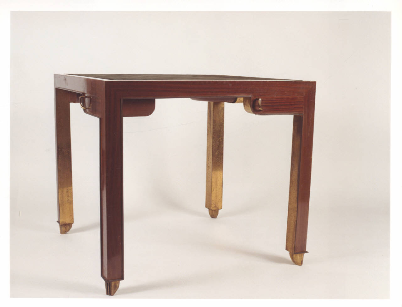 Tavolo da gioco con piano quadrato rivestito in panno verde e cassetti angolari porta fiches, appartenente ad una serie di tre, realizzato in legno di mogano su disegno di Guglielmo Ulrich. Le gambe sono fissate ad un telaio metallico, realizzato con una lamina in bronzo dorata, su cui sono saldati i piedi.
