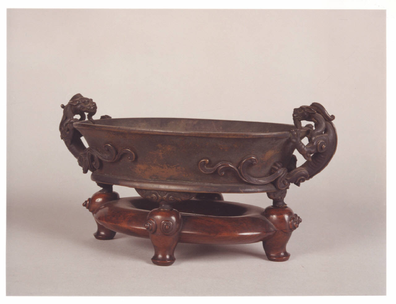 Braciere in bronzo di forma ovale con manici a forma di drago; due volute laterali, base in legno.