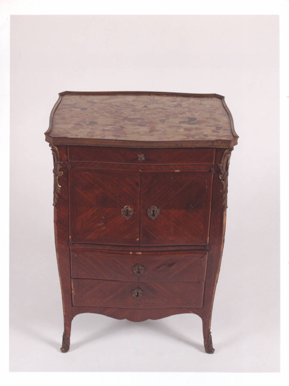 - NOTIZIE STORICO CRITICHE Lo stile Luigi XV deve il suo nome proprio a questo re di Francia, asceso al trono nel 1722. Iniziato a partire dal 1730 rimase in voga sino al 1760, connotandosi come periodo in cui si ebbe il massimo sviluppo del rococò. Il comodino sembrerebbe connotarsi, per la presenza dei bronzi, come esempio tardo di questo stile.