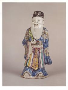 Figura maschile di anziano sorridente dalla lunga barba bianca; copricapo scuro e abito policromo. Tiene nella mano destra un oggetto non ben identificato.