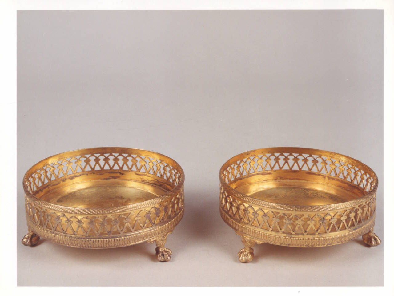 Serie di quattro sottobottiglie in argento dorato con bordura traforata e sostegni a zampa.
