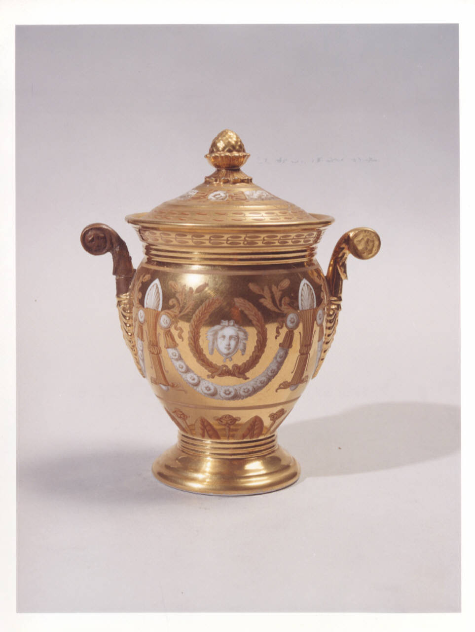 Zuccheriera in porcellana dorata e dipinta con i motivi caratteristici dello stile Impero, quali il festone di frutti e foglie, mascherone con testa femminile. Coperchio con pomolo a pigna e piccoli manici laterali a ricciolo decorati con testine di leone.