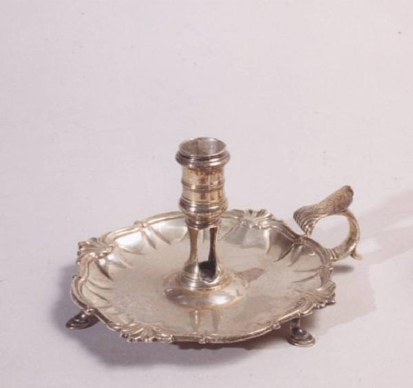 Bugia in argento costituita da una base leggermente sagomata sostenuta da quattro piedini; manico ricurvo a forma di mano guantata, portacandela centrale.