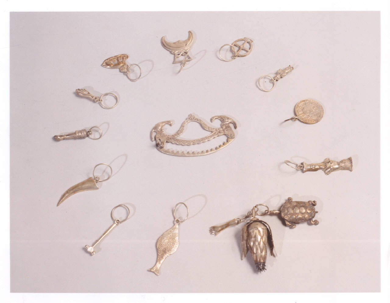 Quindici piccoli pendagli con forme diverse, probabilmente usati come monili.
