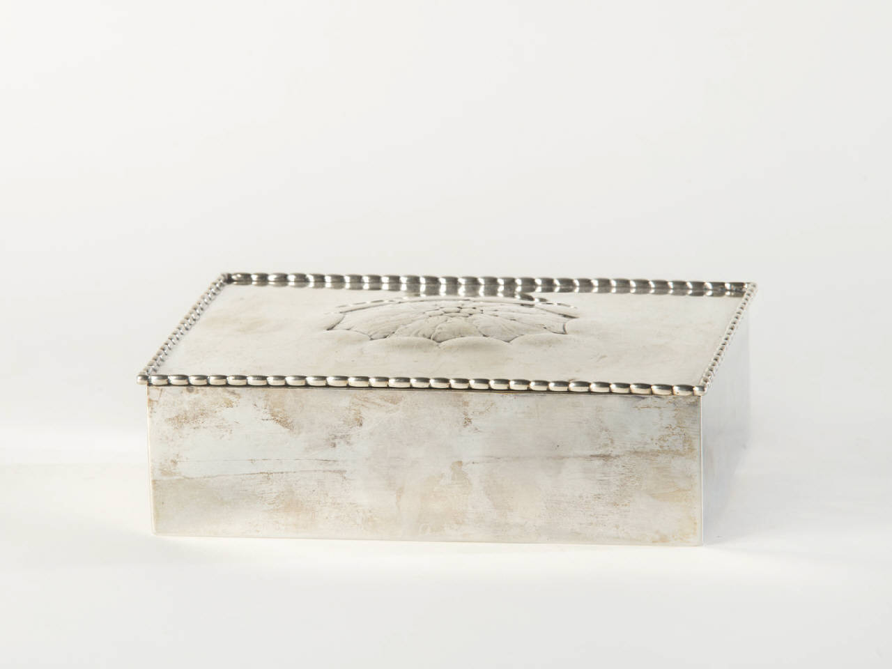 Scatola rettangolare con coperchio incernierato e decorato al centro con foglie in rilievo; bordo con piccole perline.