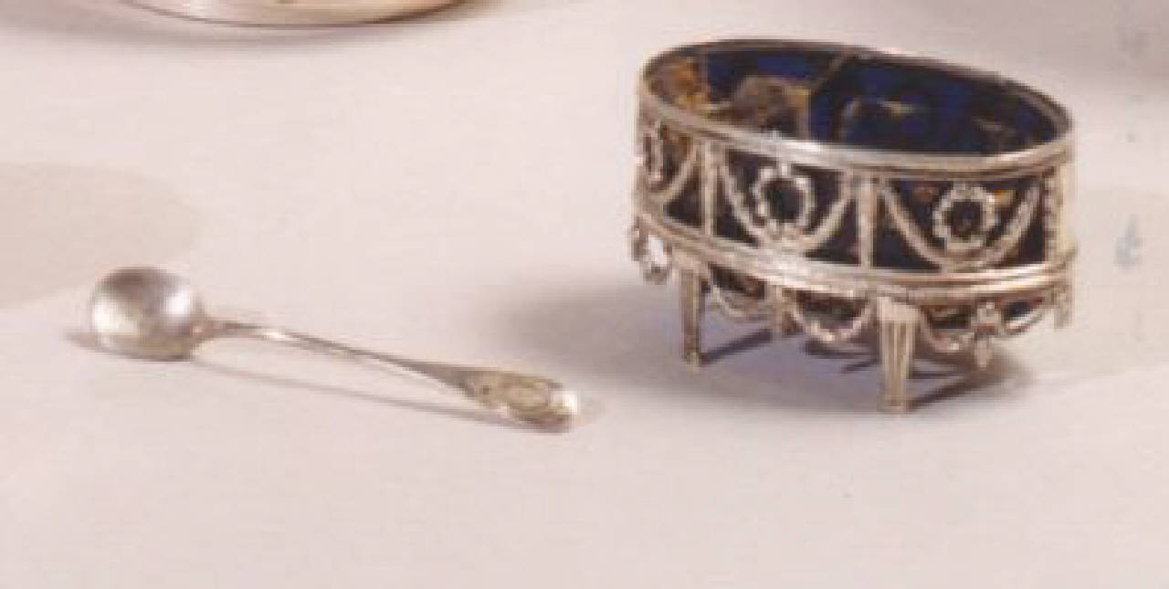 Coppia di mostardiere ovali con interno in vetro blu; struttura in argento sbalzato e traforato con motivo a ghirlanda e tondo floreale; corredate dal loro cucchiaino in argento.