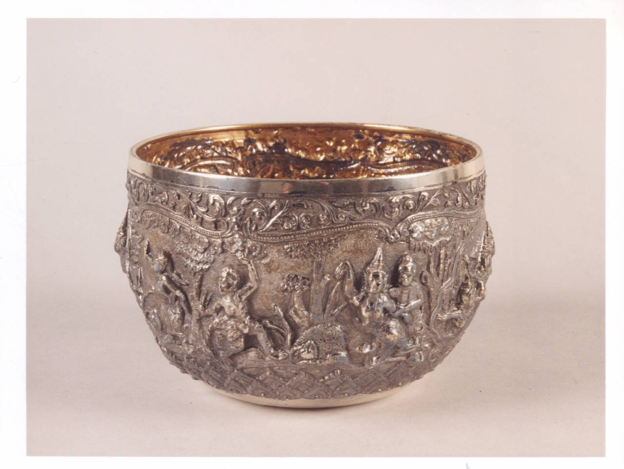 Ciotola in argento con scene di divinità a sbalzo inquadrate da alberi; il bordo superiore e quello inferiore sono profilati da un decoro floreale.