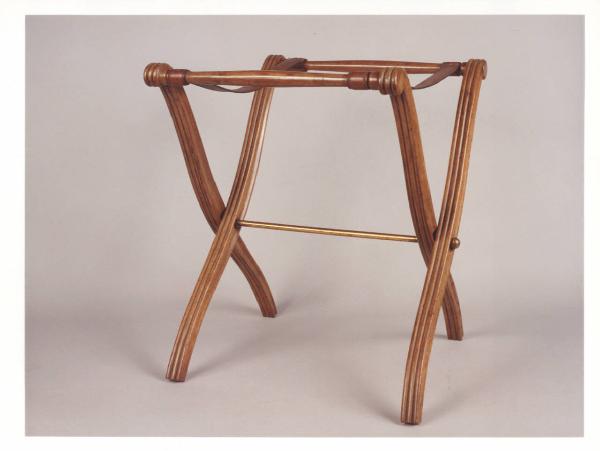 Sostegno pieghevole per vassoio con gambe scanalate e leggermente arcuate; struttura in tela per sorreggere il peso.