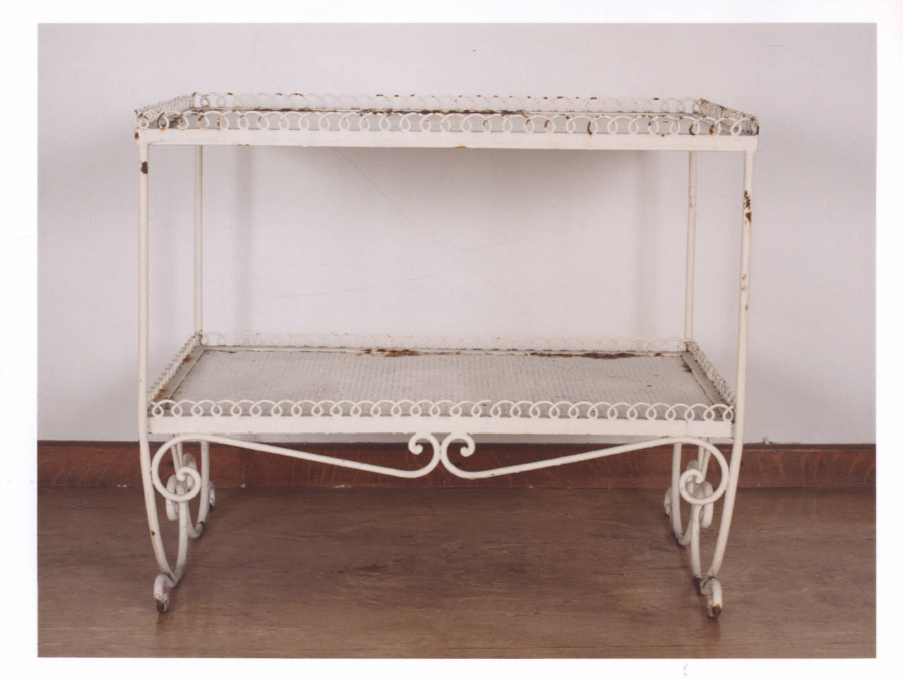 Tavolino in ferro verniciato con due ripiani forellati; piccola bordura a ondine, sostegni a ricciolo.