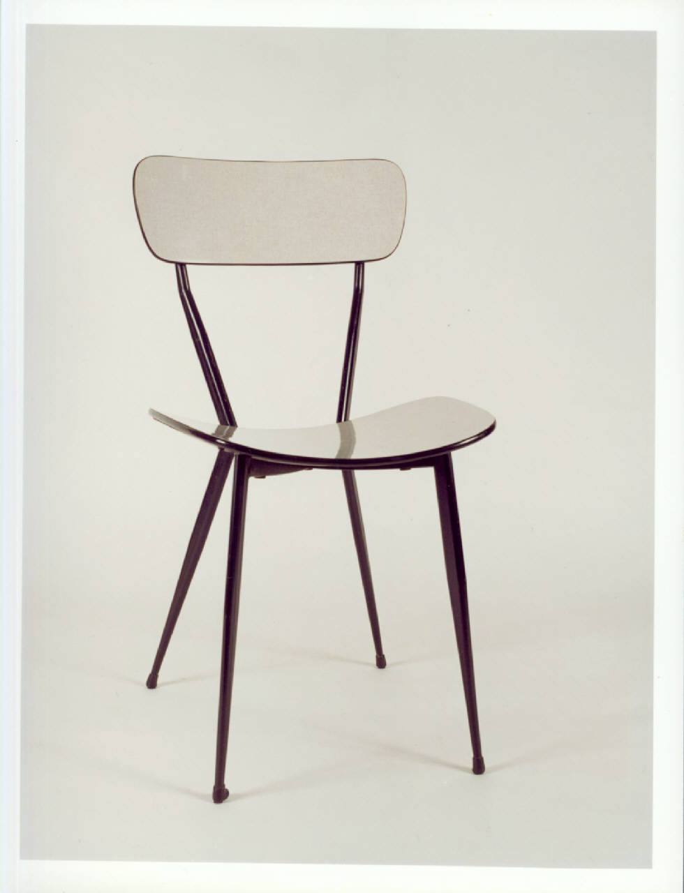 Quattro sedie in metallo e formica; spalliera a giorno con traversa nella parte superiore.