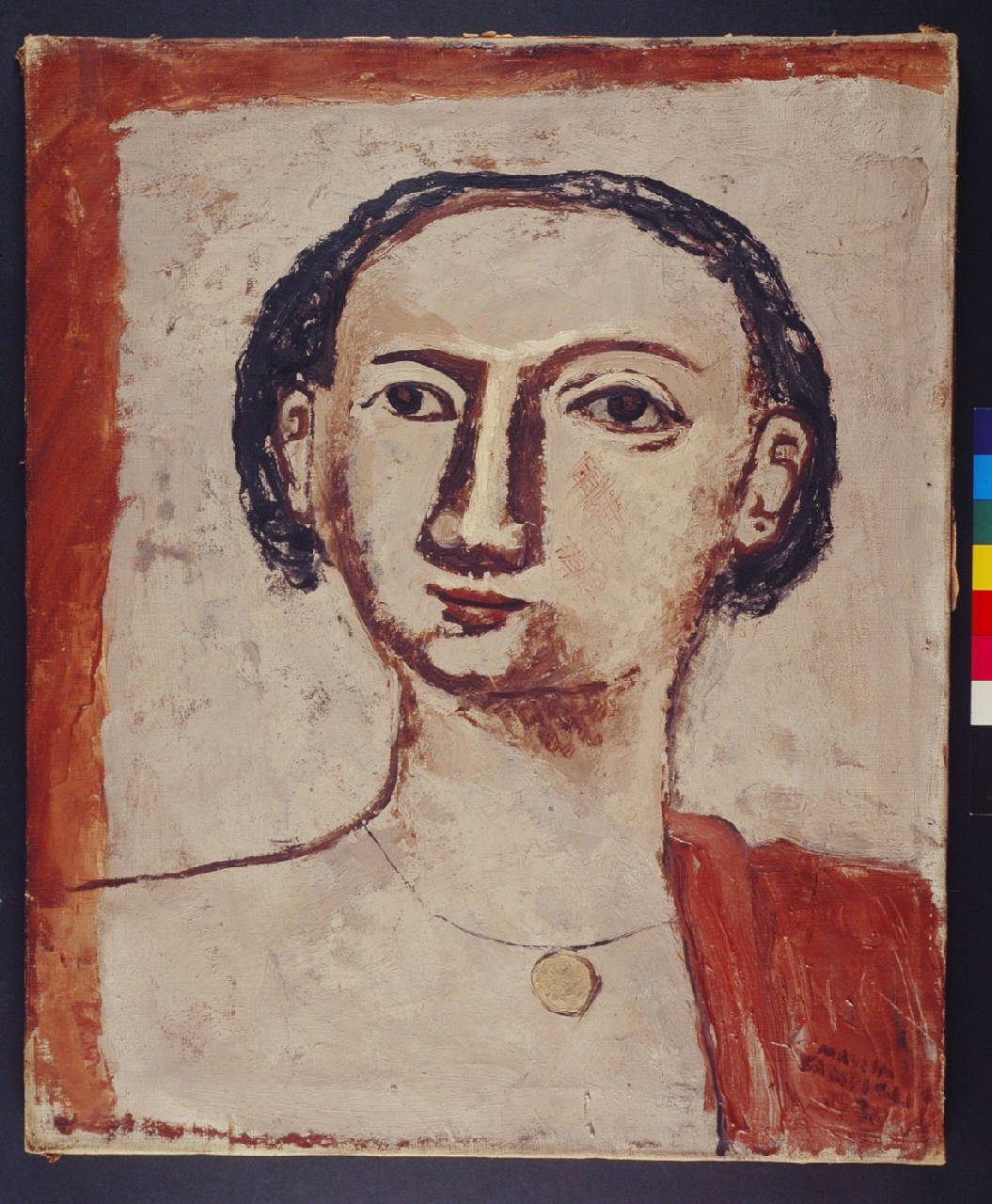 - NOTIZIE STORICO CRITICHE Il primo autoritratto di Campigli, risale al 1919, durante il suo primo viaggio a Parigi; è da questo viaggio che nasce nel pittore italiano, grazie agli incontri con i pittori francesi dei momento, il desiderio di conoscere l'arte dei primitivi. Dall'estate del 1928 in cui l'artista vede per la prima volta Villa Giulia, il Museo Nazionale Etrusco di Roma, il suo generico interesse per i primitivi si indirizzerà nello specifico verso la produzione etrusca. I caratteri dell'opera che gioca su un piano quasi monocromo con i toni del rosso, la sua semplficiazione delle forme e la resa materica vicina alla tecnica dell'affresco, riportano subito a una tradizione antica. Questa si manifesta anche nel volto dell'artista, arcaico e composto, nei suoi due piccoli gioielli e nella stola, chiara ripresa di matrice etrusca.