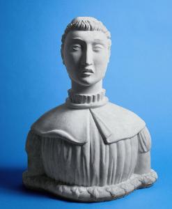 Busto in gesso di giovinetta con un punto di vista frontale privilegiato e dalle vesti che ricordano la moda del Quattrocento.