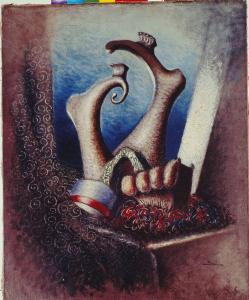 Composizione fantastica in tempera ad uovo su tela.