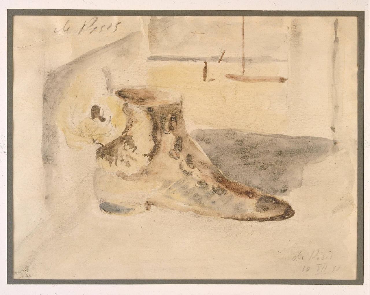 - NOTIZIE STORICO CRITICHE L'opera, donata da Claudia Gian Ferrari al FAI, è datata alla metà del soggiorno parigino del pittore, firmata al 1930 ma spesso anticipata dalla critica al 1926. Durante il soggiorno a Parigi, de Pisis affianca alle vedute della città una produzione di nature morte, tema caro al gruppo degli "Italiens de Paris" (Tozzi, Campigli, de Chirico, Savinio, Paresce). Quanto rappresentato diventa un pretesto per concentrarsi sull'atto creativo: la pennellata manifesta il pensiero dell'artista, la composizione porta con sé un'atmosfera sospesa. Protagonista di quest'opera una scarpetta con fiori che ritroveremo utilizzata come portafiori in "Natura morta" del 1931. Sullo sfondo è possibile vedere forse una tela con una marina. Anche il piccolo e semplice oggetto è tenuto nella pittura di de Pisis in grande considerazione in quanto frammento di una vita.