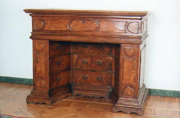 In legno intagliato, con cassetti nascosti dotati di maniglie in bronzo, lo scrittoio da notaio è probabilmente di manifattura bolognese. Risale al\n XVII secolo.