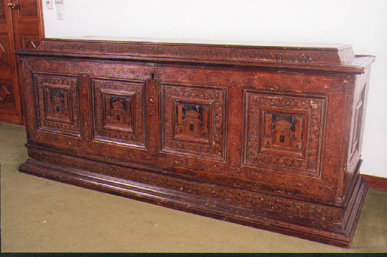 La cassapanca, in legno intagliato con quattro riquadri intarsiati, è att\nribuita a una manifattura toscana ed è databile alla seconda metà del XV\n secolo.