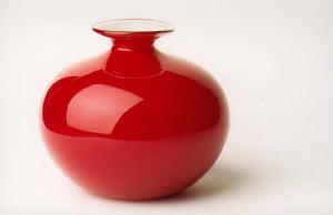 Vasetto Monofiore in vetro opalino incamiciato colore rosso e lattimo, realizzato dalla vetreria Venini di Murano.
