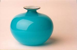 Vasetto Monofiore in vetro opalino incamiciato color acquamare e lattimo, realizzato dalla vetreria Venini di Murano.