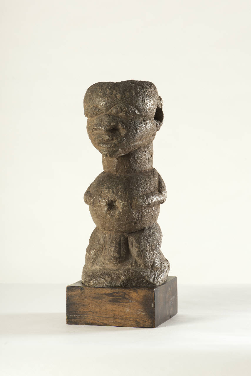 - NOTIZIE STORICO CRITICHE Primitivo Kissi, zona di Fangamadou, Guinea. Si veda l'expertise di Franco Monti allegato alla documentazione fotografica. Figura con arti inferiori breviformi e flessi, ventre prominente forato e grande testa poggiante su collo cilindrico, forata sulla sommità. Il volto presenta occhi sormont\nati da pesanti palpebre, naso dalla grandi narici e bocca ellissoidale aperta. I fori fanno supporre un uso sacrificale della statua. I Mende collocano queste statue in altari per proteggere i campi di riso e propiziare raccolti abbondanti; se questo non avviene le statue vengono frustrate. La scultura in pietra ha una sua tradizione nella regione che risale indietro nel tempo, come è in particolare il caso dei cosiddetti nomoli, statue at\ntribuite ai Sapi della Sierra Leone. Si conoscono più di quattrocento di\n queste sculture e si ritiene che abbiano diverse centinaia di anni, ma nessuno di essi è stato scoperto in un contesto archeologico e dunque resta\nno per gli storici un mistero. A trovarli sono i contadini quando zappano il terreno o i pescatori mentre pescano nei fiumi. Le interpretazioni che ne danno sono diverse in rapporto alla popolazione cui appartengono. Un nesso potrebbe esservi con i cosiddetti avori afro-portoghesi, oggetti in avorio commissionati da mercanti portoghesi alla fine del XV secolo e realizzati da artisti. Nel caso delle figurine in pietra appare però improbabil\ne che siano stati i Portoghesi stessi all¿origine di questa produzione i\nn quanto nessuna di esse sembra aver raggiunto l¿Europa all¿epoca e pe\nrché, diversamente da altri casi, nessuno dei soggetti rappresentati ha t\nratti o indumenti che possano identificarli come Portoghesi. Il ritrovamento recente di una statuina in legno che presenta evidenti somiglianze stilistiche con i nomoli in pietra e che è stata datata al radiocarbonio fra \nil 1190 e il 1394 sembra far risalire nel tempo l¿origine di queste scul\nture e avvalorarne l¿origine locale. La scultura della pietra in Africa \nnon è molto frequente e perlopiù si ricorre, come in questo caso, a piet\nre morbide come la steatite, facilmente lavorabili anche con attrezzi rudimentali. Non sembra però che si possano stabilire legami con altri centri\n africani della scultura in pietra, come quello dei Bakongo, stanziati sulla costa atlantica, nell¿attuale Repubblica Democratica del Congo. (Ivan\n Bargna)