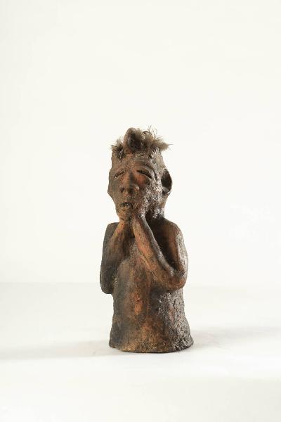 - NOTIZIE STORICO CRITICHE Primitivo Bambara, regione di Bougouni, Mali. Si veda l'expertise di Franco Monti allegato alla documentazione fotografica. Figura a mezzo busto di colore bruno-rossastro con ventre prominente e braccia aderenti al corpo che si piegano a sorreggere il mento. Le piume che compaiono sulla testa, lungo l¿acconciatura a cresta saggitale, così come i due fori al centro \ndelle orecchie e le tracce di aspersioni sulla superficie fanno supporre un uso sacrificale della statua. La figura doveva avere un numero maggiore di piume sulla testa come si desume dalla presenza di altri piccoli fori. Il volto presenta occhi ellissoidali forati disposti obliquamente, naso a base triangolare e bocca aperta. Se la scultura in legno e quella in metallo sono in Mali e più in generale in Africa una prerogativa maschile, la \nlavorazione della terracotta è invece un ambito prettamente femminile. So\nlo in pochissimi situazioni, come fra gli Hausa della Nigeria, sono gli uomini a produrre il vasellame, oppure a creare terrecotte figurative lasciando la produzione utilitaria alle donne. Nella maggior parte dei casi non viene fatta alcuna distinzione di principio fra statuaria in terracotta e vasellame e spesso anzi le due cose stanno insieme, la statuaria avendo come base il vaso e il vaso avendo come coperchio, tappo o imboccatura una figura. La lavorazione della terracotta rientra spesso tra le competenze richieste a ogni donna ma può assumere anche le caratteristiche di un¿att\nività professionale specializzata. Nelle savane dell¿Africa occidentale\n le vasaie sono le mogli dei fabbri, la cui attività si trasmette eredita\nriamente. In Mali l¿arte della terracotta risale indietro nel tempo con \ntestimonianze archeologiche che nel Delta interno del fiume Niger (il triangolo Ke Macina, Mopti, Djenné) hanno potato alla luce una statuaria dall\na ricca iconografia risalente al IX -XV secolo, forse utilizzata nell¿am\nbito di culti famigliari e di offerte votive per la guarigione da malattie o in riti di fondazione di insediamenti abitativi. Una tradizione che avrebbe avuto fine nel XV per effetto della penetrazione islamica. (Ivan Bargna)
