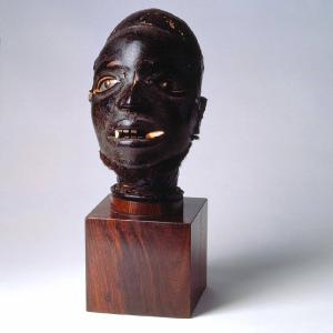 - NOTIZIE STORICO CRITICHE Primitivo Ekoi, regione Cross River tra Nigeria e Camerun. Si veda l'expertise di Franco Monti allegato alla documentazione fotografica. Cimiero che veniva fissato al costume del danzatore nascondendone il volto ed accrescendo le dimensioni del corpo. Testa ovale in legno ricoperta di pelle animale di superficie scura. La pelle fessurata lungo il setto nasale, all¿a\nltezza degli occhi e verso le orecchie, è deteriorata nella parte poster\niore. La sommità cranica è svasata e scavata all¿interno; probabilment\ne vi era inserita una sovrastruttura, oggi mancante. Il volto presenta occhi a mandorla in metallo con pupille in ottone (chiodi da tappezziere), bocca aperta con labbra carnose, denti in legno e due di animali, uno dei quali posto orizzontalmente e proiettato verso l¿esterno. Un filo di barba\n lungo il mento che arriva fino all¿attaccatura delle orecchie. Tre sca\nrificazioni cheloidali di forma cubica che vanno dagli occhi alle orecchie e altre tre a chicco di caffè ai lati della fronte. Grandi orecchie semi\ncircolari aderenti alla testa. Attaccatura dei capelli marcata da un¿inc\nisione del legno e da una linea di con chiodi in metallo. Il colo è dato \nda una in vimini che consente di attaccare la testa al costume della maschera. Le comunità del Cross River sono tradizionalmente rette dagli anzian\ni il cui potere varia in rapporto al loro grado di partecipazione alle società di culto degli antenati, alle associazioni che combattono la stregon\neria e a quelle dei cacciatori e dei guerrieri Presso gli Ejagham del Cross River la società ngbe (¿leopardo¿) raccoglieva i guerrieri ed eser\ncitava oltre alle funzioni militari anche quelle giudiziarie, politiche, commerciali, rivestendo un ruolo importante nella tratta degli schiavi. Il suo potere poggiava anche sull¿uso di una scrittura (nsibidi) che aveva \nun lato essoterico e uno esoterico. Identità e appartenenza di gruppo si \ncostruivano intorno a un insieme di simboli condivisi tra cui appunto le maschere. Le informazioni sui cimieri ejagham sono frammentarie e le ipotesi su usi e funzioni congetturali. Forse venivano usati in rituali di iniziazione e in occasione dei funerali. Essendo stati documentati anche casi di maschere ricoperte di pelle umana, si è ipotizzato (Leo Frobenius) che\n in origine si portasse sul capo direttamente la testa del nemico ucciso. La maschera è stata così interpretata come una forma di appropriazione d\nella forza del morto. Maschere in parte simili si trovano anche tra altre popolazioni stanziare fra Nigeria e Camerun: tra i Bangwa del Camerun negli anni Sessanta del secolo scorso sono rinvenute teste cornute che rappresentavano condannati decapitati oppure la figura del boia che le aveva giustiziate. Già Mansfield negli anni 1904¿1907 trovò nella regione ejagha\nm del Camerun un cranio umano ricoperto di pelle che diceva essere stato quello di uno schiavo; al teschio erano stati aggiunti capelli veri e naso, mento e orecchie in legno. Ricerche sul campo condotte nel 1977 sembrano corroborare questa ipotesi trovando tracce della di una società (nkuambik\n) la cui funzione sarebbe stato quella di punire gli schiavi ribelli tagliando loro la testa; i loro crani venivano ricoperti di pelle animale e venivano aggiunti denti di cinghiale con lo scopo di dissuadere da qualunque sollevazione. In Nigeria i cimieri degli Idoma usati nelle danze aglinye rimanderebbero ai cacciatori di teste ma si tratterebbe in realtà di una d\nanza relativamente recente importata dal Cross River (Kasfir). In un testo di Talbot (1912) amministratore coloniale inglese che visse nel primo trentennio del Novecento in Nigeria (In the Shadow of the Bush, 1912) appare l¿immagine di un danzatore mascherato ejagham che brandisce un machete e\n che porta sulla testa un cranio umano, di cui si dice avesse lo scopo di terrorizzare le donne per assicurarsi la loro fedeltà. (Ivan Bargna)