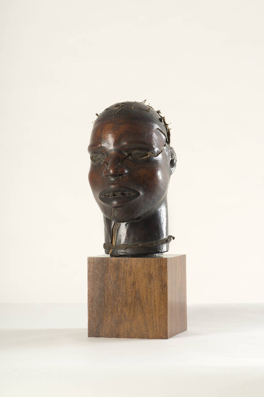 - NOTIZIE STORICO CRITICHE Primitivo Ekoi, regione Cross River tra Nigeria e Camerun. Si veda l'expertise di Franco Monti allegato alla documentazione fotografica. Cimiero che veniva fissato al costume del danzatore nascondendone il volto ed accrescendo le dimensioni del corpo. Testa ovale di legno ricoperta di pelle animale rosso brunita. Il volto, tendenzialmente realistico e fortemente espressivo, incarna la forza del guerriero e la paura che incute. Tratti caratterizzanti che convergono nel produrre l¿effetto cercato, sono la pelle a\nnimale che ricopre la testa; gli occhi a intarsio, senza pupilla, inclinati verso l¿interno, enfatizzati dalle grandi sopracciglia in rilevo e dal\nla linea nera delle palpebre inferiori; la bocca semiaperta con labbra carnose e denti superiori sporgenti in legno. Sulla sommità del cranio una c\nalotta di fibre vegetali (strappata nella parte anteriore) fissata lungo tutta la circonferenza con chiodi di legno. Attaccatura dei capelli è marc\nata da una linea di colore nero. Naso piccolo con narici ben marcate. Piccole orecchie scolpite a arco di cerchio, aderenti alla testa. La pelle presenta delle rotture lungo il naso e sul collo. Alla base del collo una corda intrecciata che ne percorre la circonferenza. Le comunità del Cross Ri\nver sono tradizionalmente rette dagli anziani il cui potere varia in rapporto al loro grado di partecipazione alle società di culto degli antenati,\n alle associazioni che combattono la stregoneria e a quelle dei cacciatori e dei guerrieri Presso gli Ejagham del Cross River la società ngbe (¿\nleopardo¿) raccoglieva i guerrieri ed esercitava oltre alle funzioni mil\nitari anche quelle giudiziarie, politiche, commerciali, rivestendo un ruolo importante nella tratta degli schiavi. Il suo potere poggiava anche sull¿uso di una scrittura (nsibidi) che aveva un lato essoterico e uno esote\nrico. Identità e appartenenza di gruppo si costruivano intorno a un insie\nme di simboli condivisi tra cui appunto le maschere. Le informazioni sui cimieri ejagham sono frammentarie e le ipotesi su usi e funzioni congetturali. Forse venivano usati in rituali di iniziazione e in occasione dei funerali. Essendo stati documentati anche casi di maschere ricoperte di pelle umana, si è ipotizzato (Leo Frobenius) che in origine si portasse sul ca\npo direttamente la testa del nemico ucciso. La maschera è stata così int\nerpretata come una forma di appropriazione della forza del morto. Maschere in parte simili si trovano anche tra altre popolazioni stanziare fra Nigeria e Camerun: tra i Bangwa del Camerun negli anni Sessanta del secolo scorso sono rinvenute teste cornute che rappresentavano condannati decapitati oppure la figura del boia che le aveva giustiziate. Già Mansfield negli \nanni 1904¿1907 trovò nella regione ejagham del Camerun un cranio umano \nricoperto di pelle che diceva essere stato quello di uno schiavo; al teschio erano stati aggiunti capelli veri e naso, mento e orecchie in legno. Ricerche sul campo condotte nel 1977 sembrano corroborare questa ipotesi trovando tracce della di una società (nkuambik) la cui funzione sarebbe stat\no quella di punire gli schiavi ribelli tagliando loro la testa; i loro crani venivano ricoperti di pelle animale e venivano aggiunti denti di cinghiale con lo scopo di dissuadere da qualunque sollevazione. In Nigeria i cimieri degli Idoma usati nelle danze aglinye rimanderebbero ai cacciatori di teste ma si tratterebbe in realtà di una danza relativamente recente imp\nortata dal Cross River (Kasfir). In un testo di Talbot (1912) amministratore coloniale inglese che visse nel primo trentennio del Novecento in Nigeria (In the Shadow of the Bush, 1912) appare l¿immagine di un danzatore m\nascherato ejagham che brandisce un machete e che porta sulla testa un cranio umano, di cui si dice avesse lo scopo di terrorizzare le donne per assicurarsi la loro fedeltà. (Ivan Bargna)