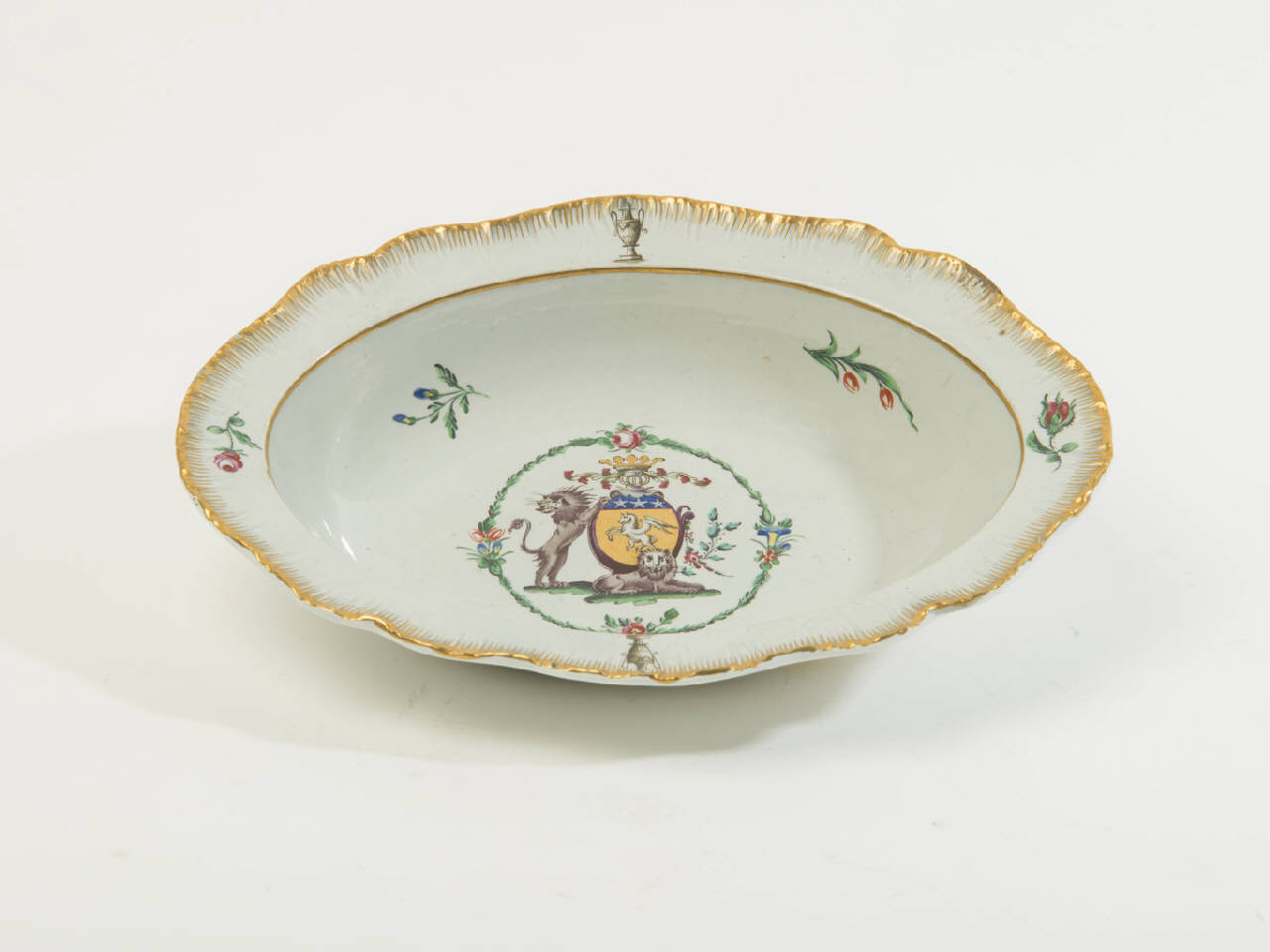 Vassoietto ovale di servizio in terraglia con bordo lobato e sfrangiato. Decoro araldico costituito da uno stemma e leoni.