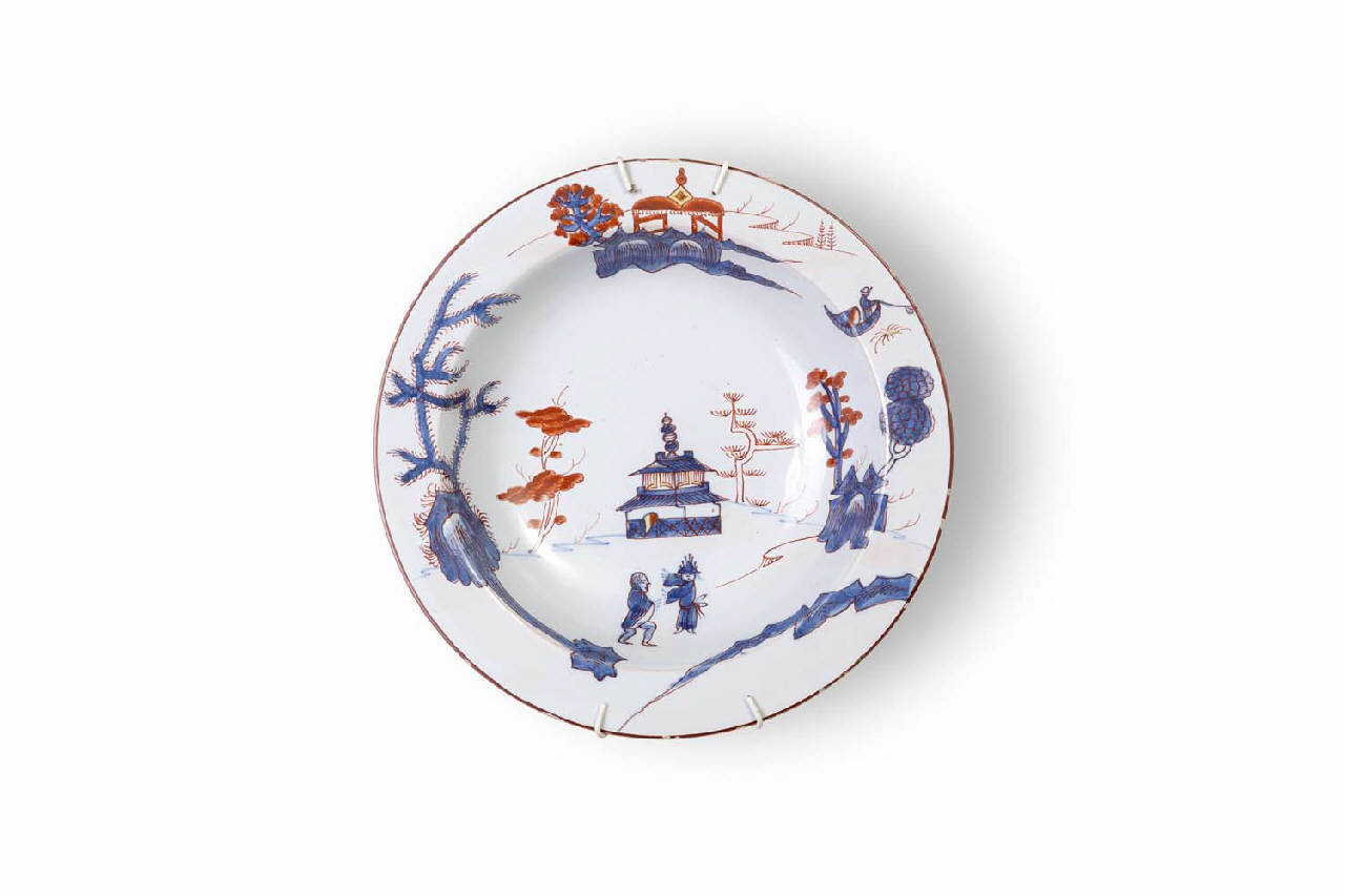L'insieme, costituito da 12 piatti fondi in maiolica con decorazioni "a carabiniere" rosse e blu, proviene dalla fabbrica milanese di Felice Clerici o da quella di Pasquale Rubati ed è databile tra il 1750 e il 1770.