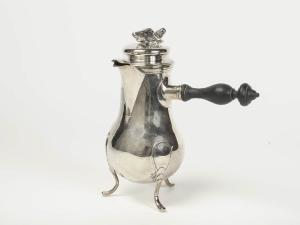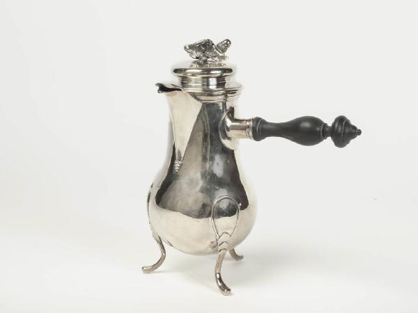 Piccola cioccolatiera con corpo liscio periforme, manico laterale in legno tornito, tre piedini, presa del coperchio decorata con ghianda e foglie di quercia.