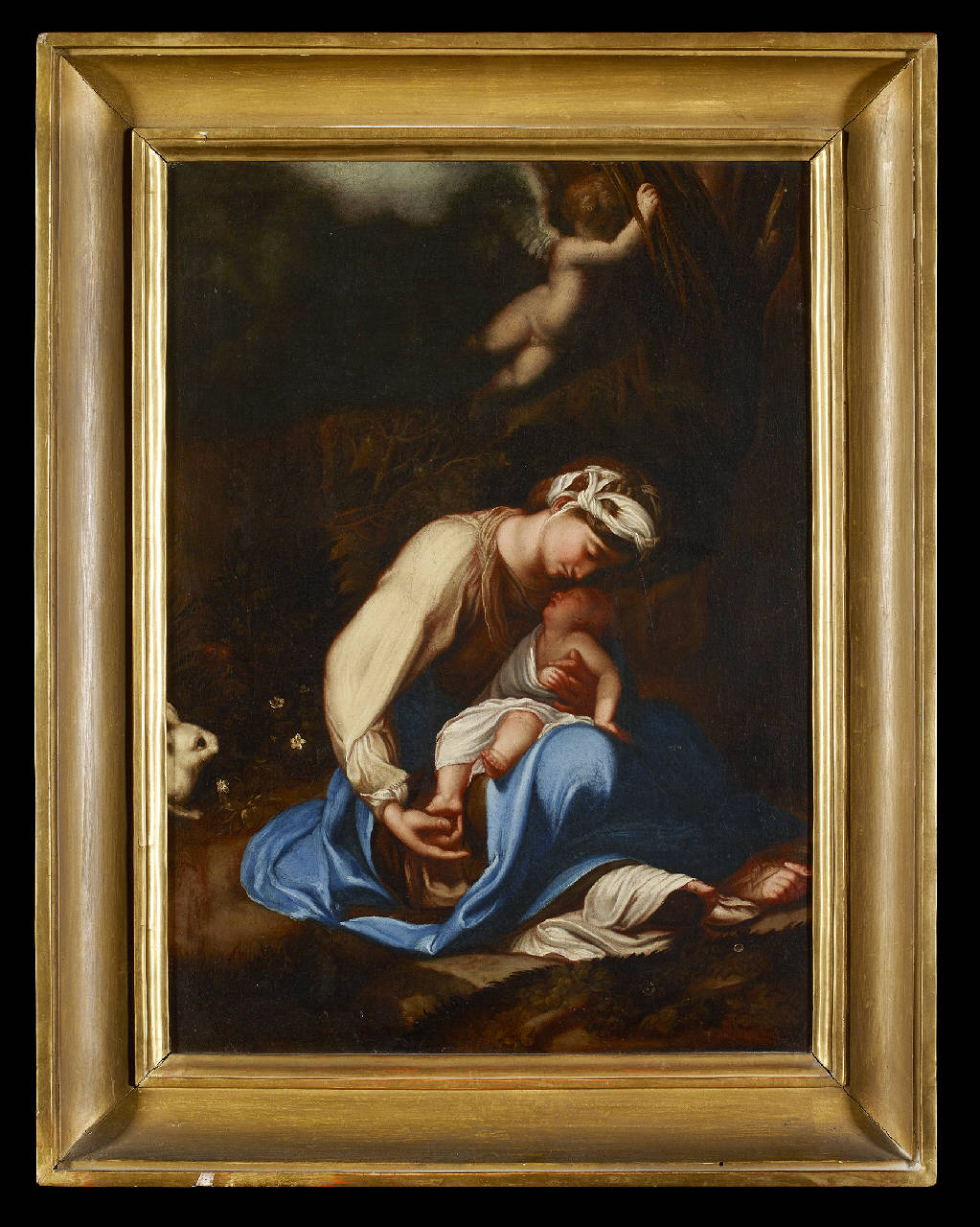 - NOTIZIE STORICO CRITICHE Il dipinto è una copia antica su tela, databile alla seconda metà del XV\nII secolo, della ¿Madonna con Bambino¿ (la ¿Zingarella¿) di Antoni\no Allegri detto Correggio (1515-1516), oggi al Museo Nazionale di Capodimonte (inv. 107). Registrato a Parma nel 1587 tra le opere del Guardaroba di Ranuccio Farnese come ¿Madona in habito di cingana¿, il dipinto origi\nnale fu ereditato nel 1607 dalla sorella di Ranuccio, Margherita, monaca del Convento di San Paolo. Dopo la morte di Margherita, la tavoletta rientrò nelle collezioni ducali; giunta a Napoli nel 1734, quando Carlo I di Bo\nrbone si impadronì del Regno delle Due Sicilie, vi rimase fino al 1798; a\n questa data Ferdinando IV la scelse con altri tredici dipinti per portarla con sé a Palermo in esilio. Ritornò a Napoli nel 1815, e qui rimase. S\nfortunate sono le sue vicende conservative: la tavola fu oggetto di numerosi e precocissimi interventi di ridipintura, i primi dei quali sarebbero già da collocare tra il 1550 e il 1570. La situazione era destinata a pegg\niorare nei secoli successivi: già Jonathan Richardson (1722) e Anton Raph\nael Mengs (1787) lamentavano le cattive condizioni del dipinto, i cui ritocchi rendevano impossibile il riconoscimento dello stile di Correggio. Un goffo restauro (1934-1935) ha cercato di riportare il dipinto alle sue condizioni originarie, impoverendo irrimediabilmente lo strato pittorico ed eliminando dettagli preziosi. Al restauro del 1934-35 è seguito un secondo\n intervento nel 1965-66, in occasione del quale sono stati recuperati il cielo e il paesaggio sulla destra e sono state effettuate indagini a raggi X, che hanno rivelato un¿informazione molto interessante: la tavola era \ngià stata utilizzata da Correggio per la raffigurazione di un ¿Cristo p\nortacroce¿, per poi essere destinata ad altro. L¿iconografia del dipin\nto prima del 1934 è documentata da copie, stampe di traduzione e fotograf\nie. Tra queste, compare anche la copia di Palazzo Moroni, che svolge in questo senso una preziosa testimonianza: essa, infatti, riproduce le condizioni del dipinto originale in una fase che segue le prime ridipinture, ma che anticipa la drammatica pulitura degli anni Trenta. La tela, inoltre, ha le medesime dimensioni della tavola. La scena è da collegare molto proba\nbilmente, nonostante l¿assenza di San Giuseppe, al Riposo durante la fug\na in Egitto: la Vergine, accovacciata a terra, si china dolcemente sul Bambino addormentato. La posizione della Vergine verrà recuperata da Caravag\ngio nel suo celebre dipinto dedicato allo stesso episodio evangelico, oggi alla Galleria Doria Pamphilj di Roma. Rispetto all¿originale, si osserv\nano alcuni dettagli, visibile in altre copie dipinte e a stampa: sulla sinistra compare un coniglietto, mentre in alto a destra un angelo solleva una palma; diversa è la posizione del volto e del braccio sinistro del Bamb\nino, come pure la raffigurazione dei calzari all¿antica della Madonna. N\numerose sono le copie della ¿Zingarella¿, alcune delle quali già nell\ne raccolte farnesiane: le più celebri si conservano all¿Escorial di Mad\nrid e alla Pinacoteca Ambrosiana (la seconda con una tradizionale attribuzione a Fede Galizia), ma altre copie sono state individuate a Modena (Galleria Campori), Praga (Národní Galerie, attribuita a Joseph Heintz), Glas\ngow, Potsdam e sul mercato antiquario (Sotheby¿s, 20 aprile 1988, lotto \n271). Del dipinto esistono inoltre moltissime traduzioni a stampa, realizzate tra Sei e Ottocento.