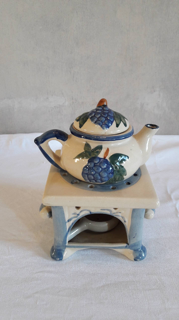 Veilleuse in porcellana dipinta a mano con motivi decorativi vegetali a rilievo e policromi (grappoli d'uva); profili blu per gli orli. Composta da quattro elementi: fusto quadrato con apertura per il godet su una delle facce; godet (piccolo recipiente atto a contenere l'olio e il lucignolo) posto all'interno del fusto; teiera con manico e piccolo beccuccio; coperchio con presa a pomolo.