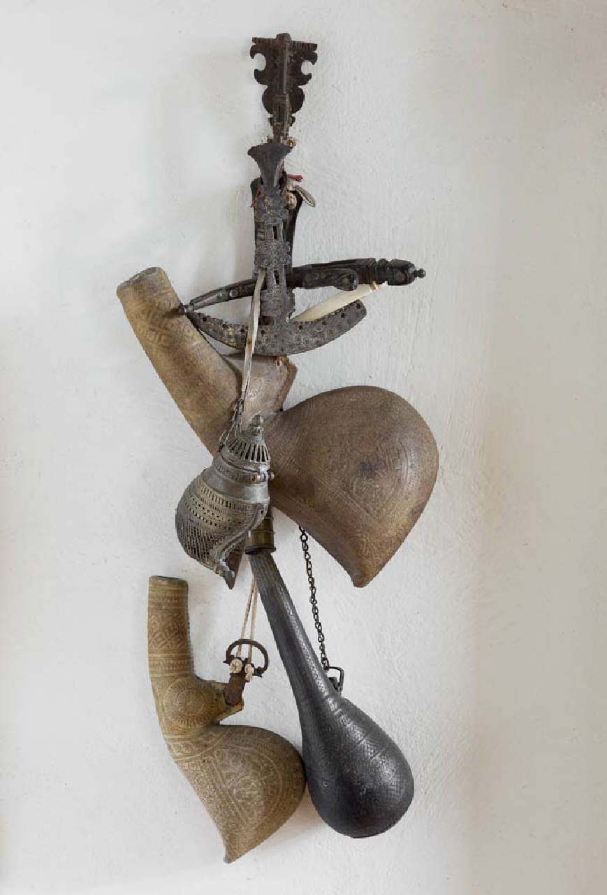 La piccola fiasca per polvere da sparo è in pelle chiara decorata ed è p\nriva di coperchio. Appartiene a un insieme di undici oggetti di origine africana, appesi a un gancio di ferro nello studio di Giuseppe Roi.