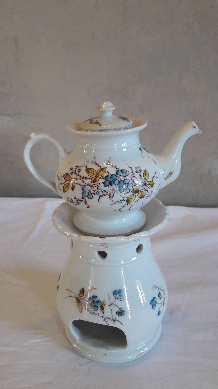 La veilleuse si compone di quattro elementi: fusto a bulbo terminato da orlo a smerlo, apertura in basso per il godet, fori circolari per areazione nella parte superiore; godet all'interno del fusto; teiera periforme con lungo becco e manico ad orecchio con bitorzolo; coperchio con presa a pomolo. La decorazione del fusto e della teiera consta di piccoli fiori blu e rami con foglie verdi dipinti a mano.