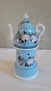 Veilleuse composta da tre parti: fusto a sezione circolare con leggera sguscia nella parte inferiore e apertura per il godet, fori per areazione nella parte superiore, orlo superiore espanso; teiera dalla forma panciuta con invaso, orlo superiore espanso, grande manico ad orecchio, beccuccio mosso; coperchio con presa a punta. A fondo azzurro, presenta una decorazione floreale e foglie dipinta a mano sul corpo del fusto, sulla teiera e sul relativo coperchio; sottili profilature dorate per gli orli.