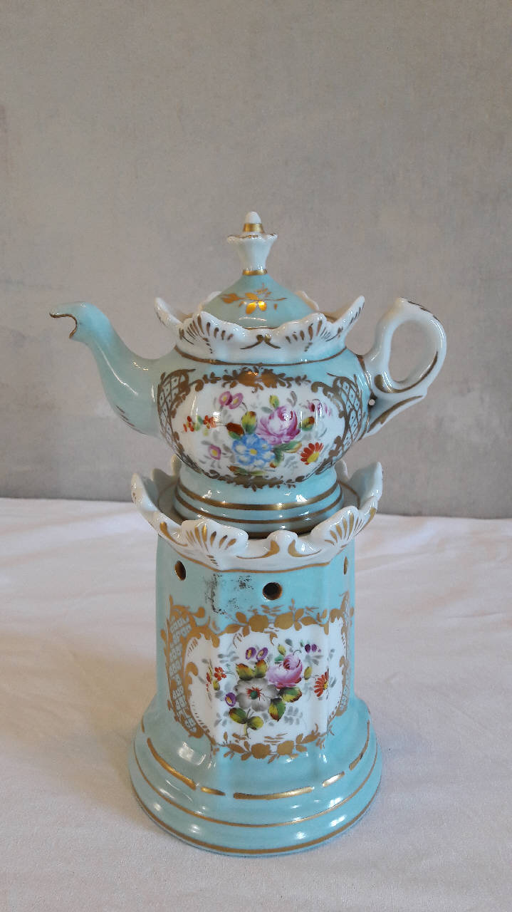 La veilleuse si compone di tre elementi: fusto con piede rastremato verso l'alto, apertura per il godet, fori superiori per l'areazione, orlo in aggetto terminato da smerlo; teiera con orlo espanso smerlato, manico ad orecchio con bitorzolo e beccuccio mosso; coperchio con presa a punta. Presenta un fondo azzurro chiaro, fusto e teiera sono riccamente decorati con decorazione floreale policroma entro cornici dorate; motivi floreali sparsi realizzati in oro e profilature dorate per gli orli e le varie componenti. Di fattura novecentesca che riprende i modelli dell'800.