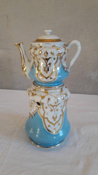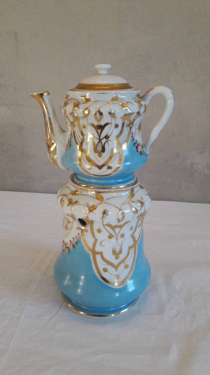 La veilleuse si compone di tre elementi: fusto a bulbo con apertura per il godet nella parte inferiore, fori di areazione nella parte superiore; teiera con manico a orecchio, coperchio con presa pomolo, beccuccio mosso. A fondo azzurro, è riccamente decorata con motivi decorativi dorati e picco\nli fiori rosa e foglioline verdi. Profilature dorate per gli orli del fusto e della teiera, del manico e del beccuccio.