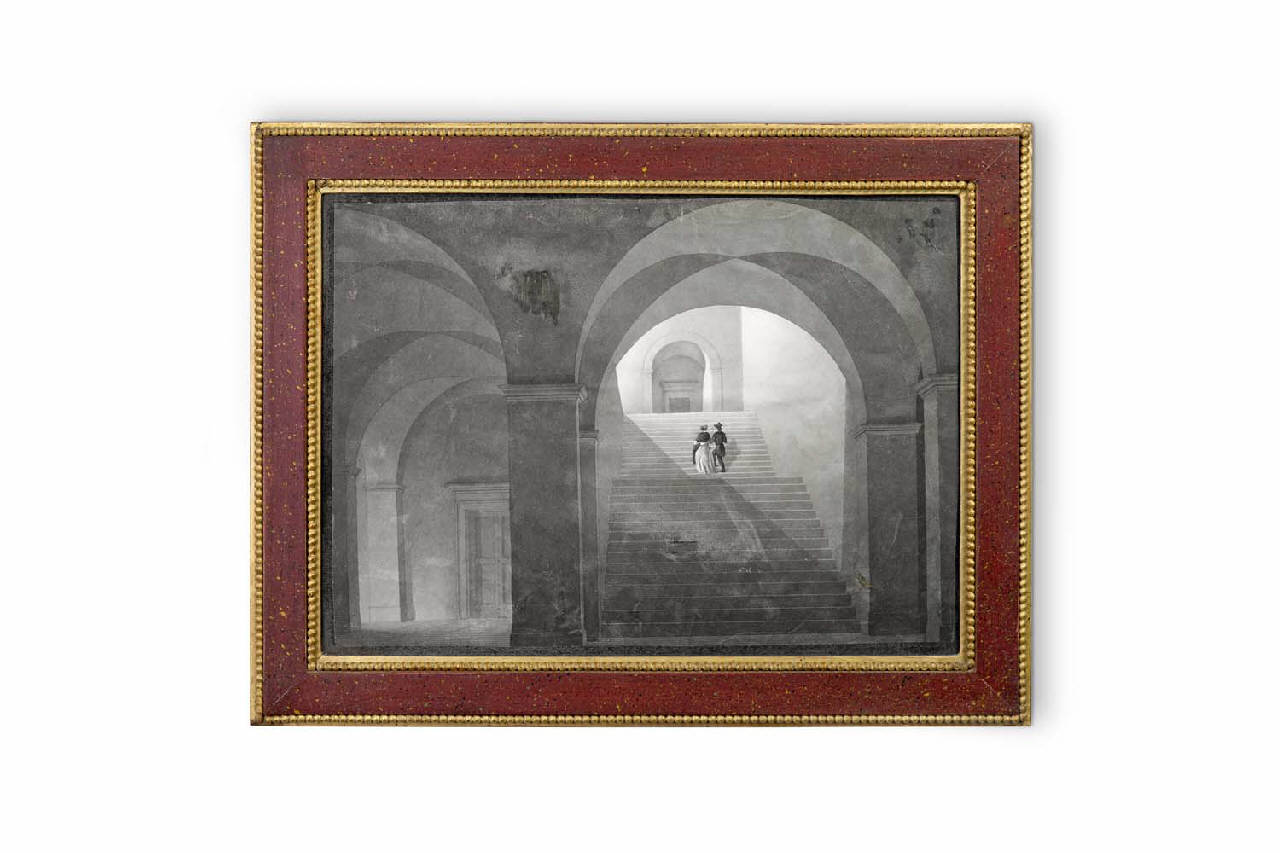 L'acquerello monocromo, di formato rettangolare, raffigura l'androne di una casa con figure. E' opera di un pittore italiano ed è da collocare all'\ninizio del XVIII secolo. Dotato di una cornice in legno, è orientato in o\nrizzontale.