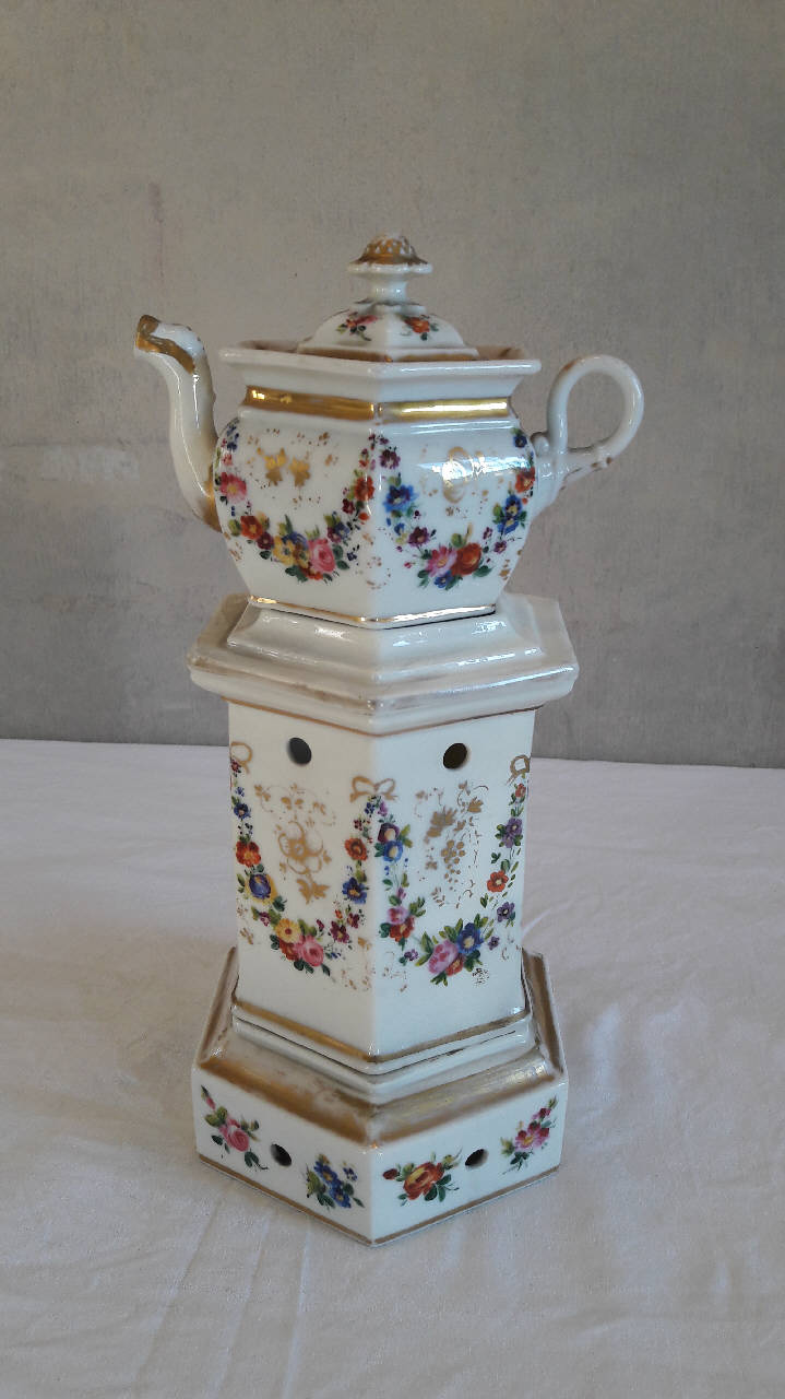 Veilleuse composta da quattro parti: base esagonale con fori per areazione; fusto a sezione esagonale, orlo inferiore rastremato verso l'alto e superiore aggettante, con profilo elaborato, aperture per areazione nella parte superiore; teiera con invaso, di forma esagonale, orlo superiore espanso, manico ad anello, beccuccio mosso; coperchio con presa a fiore. La decorazione dipinta a mano è data da ghirlande di piccoli fiori multicolore e \nmotivi decorativi vegetali dorati. Profilature dorate per i diversi orli, per il manico e il beccuccio della teiera, pomolo dorato.