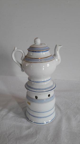 La veilleuse si compone di tre elementi: fusto a sezione circolare, foro per il godet nella parte inferiore, fori per l'areazione nella parte superiore, base e orlo svasato; teiera dalla forma panciuta con manico ad orecchio con bitorzolo, beccuccio mosso; coperchio con presa a frutto. A fondo bianco, presenta una semplice decorazione lungo la circonferenza data da motivi circolari di colore blu e oro; profilature dorate lungo il manico, il beccuccio e il pomolo del coperchio.