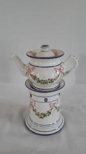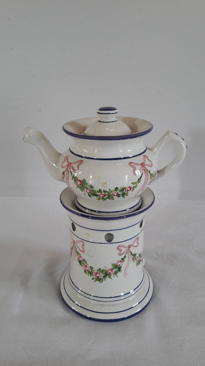 La veilleuse si compone di quattro elementi: fusto circolare lievemente svasato al fondo con apertura per il godet, fori circolari di areazione in alto, orlo superiore sporgente; godet all'interno del fusto; teiera di forma panciuta con manico a orecchio, beccuccio mosso; coperchio con presa a pomolo. Decorazione data da festoni di fiori e foglie con nastri rosa; profilature blu per i diversi orli. Di fattura novecentesca che riprende modelli dell'800.