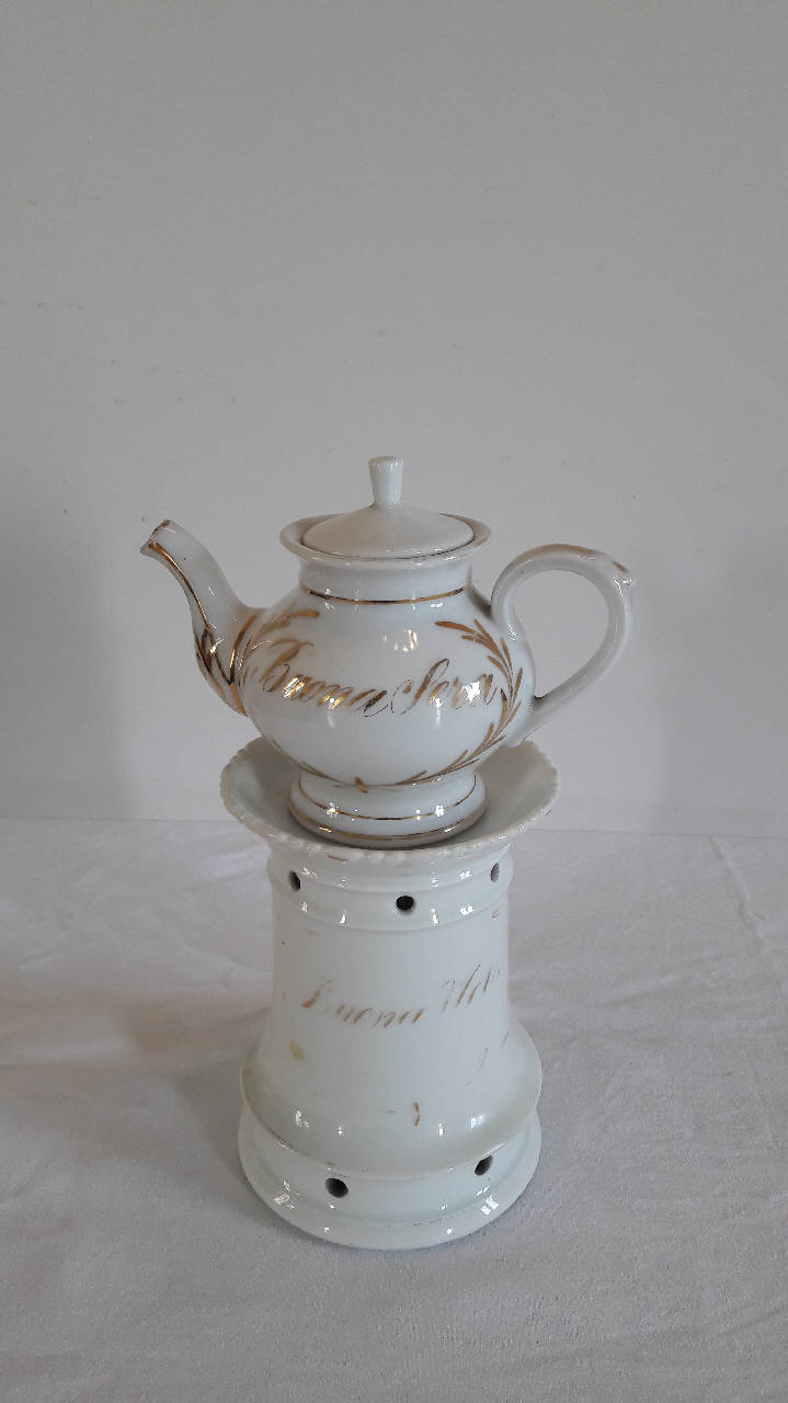 Veilleuse in porcellana a fondo bianco composta da quattro elementi: base circolare con fori per areazione, fusto cilindrico con orlo superiore a smerlo e svasato, fori circolari superiori per areazione; teiera panciuta con manico ad orecchio, beccuccio mosso, coperchio con presa a pomolo. Profilature dorate per gli orli, scritte in oro, motivi decorativi vegetali dorati.
