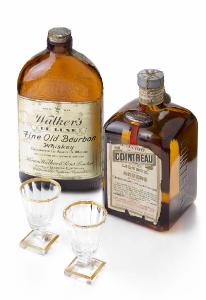 Due bicchieri da rosolio, in vetro trasparente con profilo dorato sia sul piedino sia lungo il bordo.