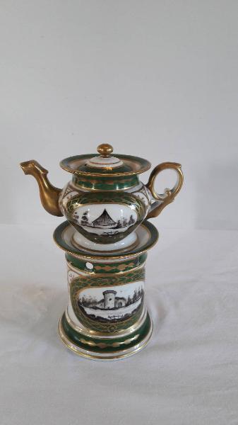 La veilleuse si compone di quattro elementi: fusto a sezione circolare con leggera sguscia nella parte inferiore e apertura per il godet, fori circolari per areazione nella parte superiore, orlo superiore espanso; godet all'interno del fusto; teiera di forma panciuta con invaso, parte inferiore lievemente allungata, orlo superiore espanso, manico ad orecchio, beccuccio mosso terminante con protome animale; coperchio con presa circolare. Presenta su fondo bianco delle fasce circolari verdi profilate in oro con all'interno motivi decorativi vegetali stilizzati sempre in oro. Decorazioni monocrome di colore nero raffiguranti edifici entro medaglioni circolari delimitati da cornici esterne di colore verde profilate in oro, recanti all'interno motivi vegetali stilizzati dorati. Profilature dorate per gli orli; il beccuccio, il manico e il pomolo della teiera sono dipinti in oro. Di fattura novecentesca che riprende i modelli dell'800.