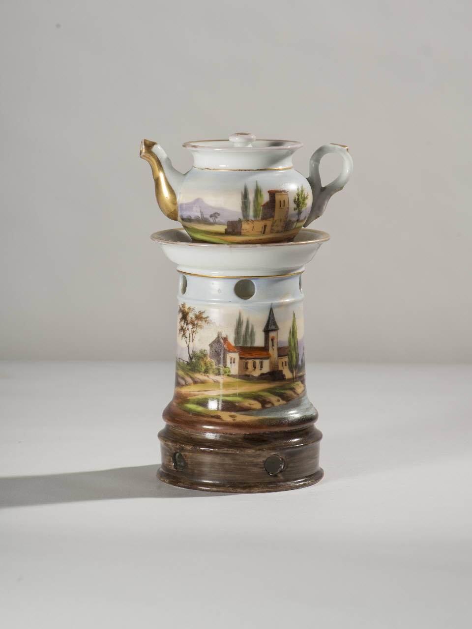 Veilleuse in porcellana dipinta a mano con decorazione raffigurante paesaggi con case rurali, vegetazione, montagne sullo sfondo e corso d'acqua; profilature dorate per gli orli. Composta da quattro parti: base ad anello rastremata verso l'alto con fori per areazione; fusto a sezione circolare rastremato verso l'alto con fori per areazione, orlo superiore espanso; teiera di forma panciuta con invaso, orlo superiore espanso, manico ad orecchio; coperchio con presa a forma sferica.