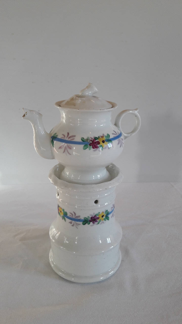 Veilleuse composta da quattro pezzi: fusto a sezione circolare con restringimento nella parte centrale, fori per areazione nella parte superiore, apertura inferiore per il godet, orlo superiore espanso leggermente mosso; godet posto all'interno del fusto; teiera di forma panciuta con invaso, orlo superiore espanso, manico ad anello con bitorzolo, beccuccio mosso; coperchio con foro e presa a forma di frutto con foglioline. A fondo bianco, presenta una decorazione dipinta a mano data da motivi decorativi floreali lungo una linea circolare di colore azzurro. Tracce di doratura lungo gli orli del manico e la parte terminale del beccuccio.