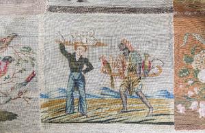 Il grande tappeto, decorato a piccolo punto con venticinque riquadri a soggetti vari, è opera di una manifattura inglese o francese e appartiene al\nla seconda metà del XIX secolo.