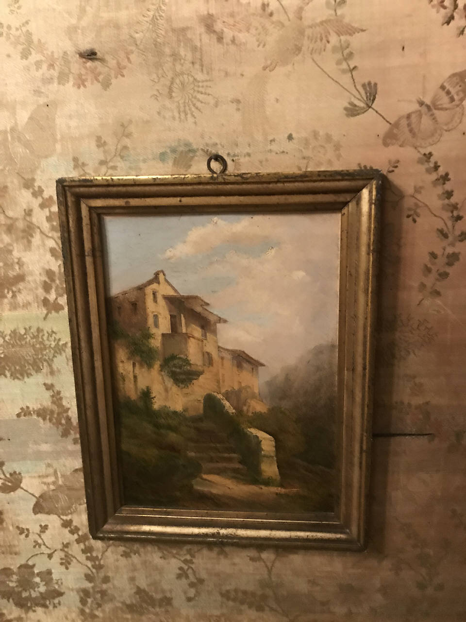 Il dipinto, a olio su cartone, è un paesaggio montano con architettura. D\ni piccolo formato rettangolare, è orientato in verticale e dotato di una \nmoderna cornice in legno dorato.