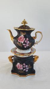 Veilleuse in porcellana dipinta a mano decorata su fondo nero con raffigurazioni di motivi floreali dati da rose color rosa e foglie dorate; profilature dorate per gli orli e i diversi componenti. Composta di quattro pezzi: fusto a base mistilinea rastremato verso l'alto, orlo superiore aggettante con profilo elaborato, due anse laterali sporgenti, apertura laterale per il godet che si trova all'interno del fusto, fori circolari in alto per areazione; teiera con invaso, orlo inferiore restringentesi verso l'alto, corpo bombato, orlo superiore molto espanso, con profilo elaborato, manico ad orecchio e beccuccio mosso; coperchio con presa "a pennacchi". Di fattura novecentesca che riprende i modelli di metà dell'800.